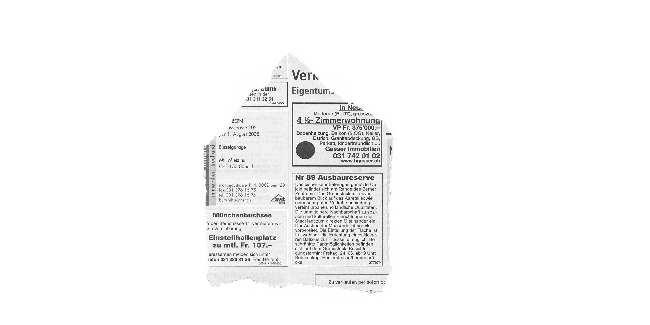 „Der Pavillon der Stadtgalerie steht zum Verkauf. Es ist ein Angebot von Stefan Mauck. Eine sogenannte Ausbaureserve ist dabei entstanden, auf die potentielle Interessenten in einem Inserat im Berner Anzeiger aufmerksam gemacht werden. In Anlehnung an die übliche Makler-Rhetorik werden die negativen Aspekte der städtebaulich problematischen Parzelle verschwiegen und stattdessen die gute Verkehrsanbindung, der unüberbaubare Blick auf das Aaretal sowie die unmittelbare Nachbarschaft zu sozialen und kulturellen Einrichtungen gepriesen.
