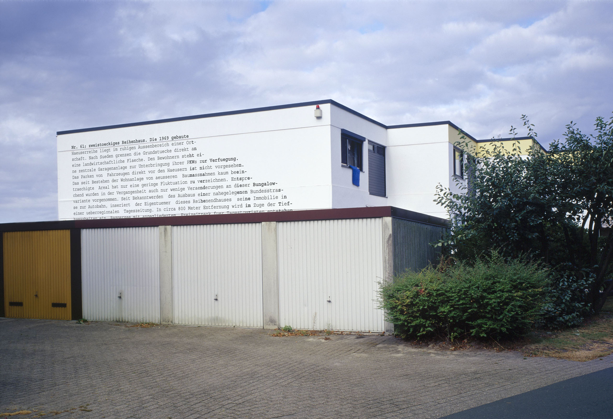 „Diese Spannung, die aus den besagten gegensätzlichen Sphären entsteht, macht sich die Arbeit Stefan Maucks zunutze. Mauck setzt dabei an einem dringenden menschlichen Bedürfnis an, der Neugier. Der Betrachter verbindet die Auskünfte, die ihm die Texte geben, mit subjektiv an oder über diesem Ort Erlebtem und Empfundenem. Es geht um den Wunsch nach erweiterter Sicht auf das Umfeld, nach tieferen Kenntnissen über es und über andere. Mauck bestätigt den Wunsch, die Dinge aus ihrer Innenschau zu kennen, intime Einsichten zu gewinnen. Jedoch befriedigt er diese Sehnsucht nur unzulänglich, erweisen sich doch die gegebenen Informationen als austauschbare Module, so austauschbar und unspezifisch – irgendwie auch monoton - wie die Architektur selber, auf denen sie angebracht sind. Insofern spiegelt die Arbeit auch etwas Erschreckendes wieder: die Austauschbarkeit von Modellen – seien es Wohnmodelle, Lebensmodelle oder Denkmodelle. I