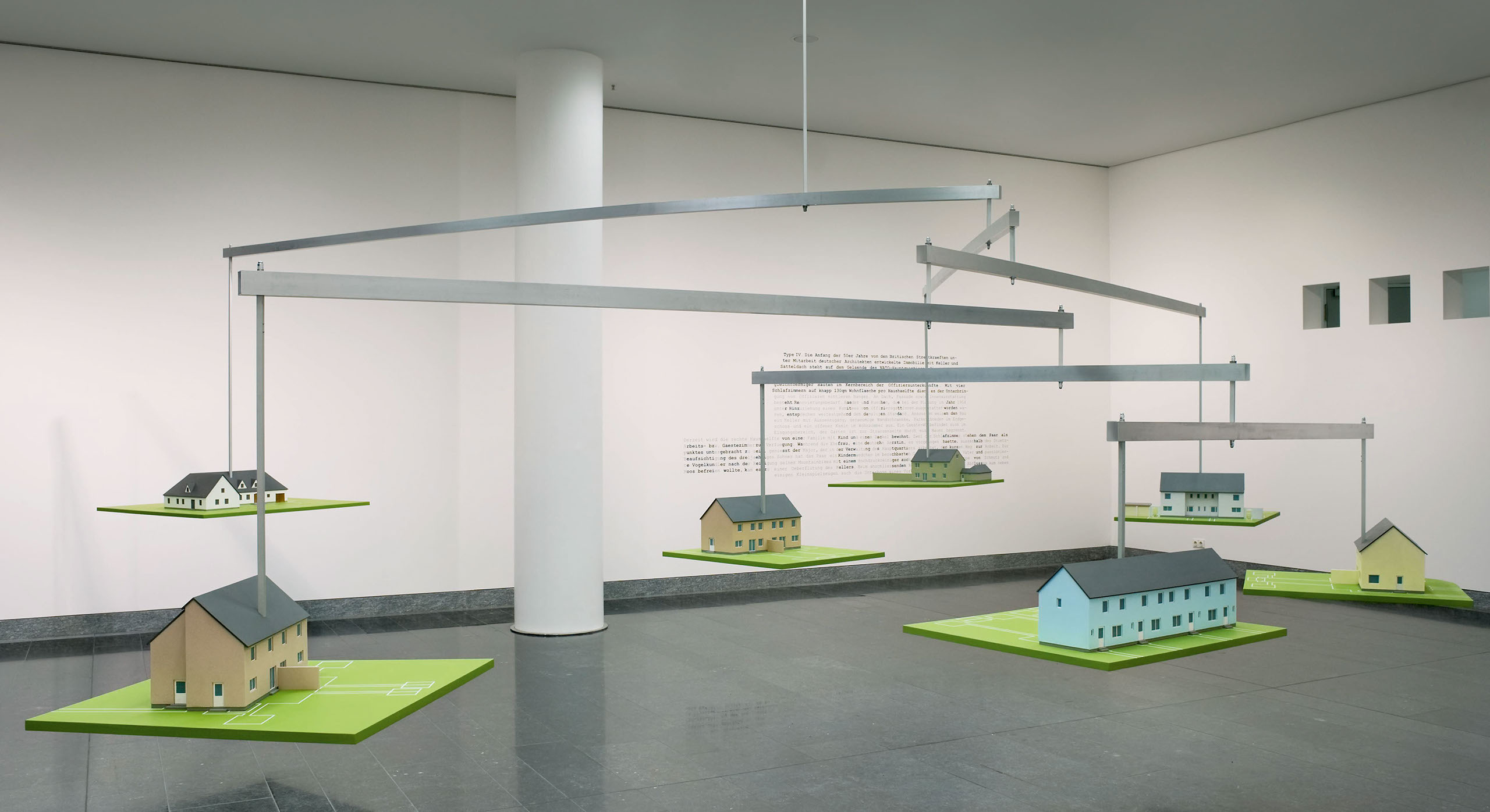 In der Ausstellungssituation wird das fragile Zusammenspiel von räumlicher und militärischer Ordnung in Form eines raumgreifenden Mobilés gezeigt. Mit einem Durchmesser von circa zehn Metern schweben Gebäudekomplexe im Raum und suchen im Zusammenspiel der Formen ihr Gleichgewicht. Der Raum wird durch Textbilder sowie Fotoarbeiten ergänzt.