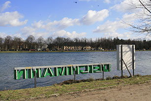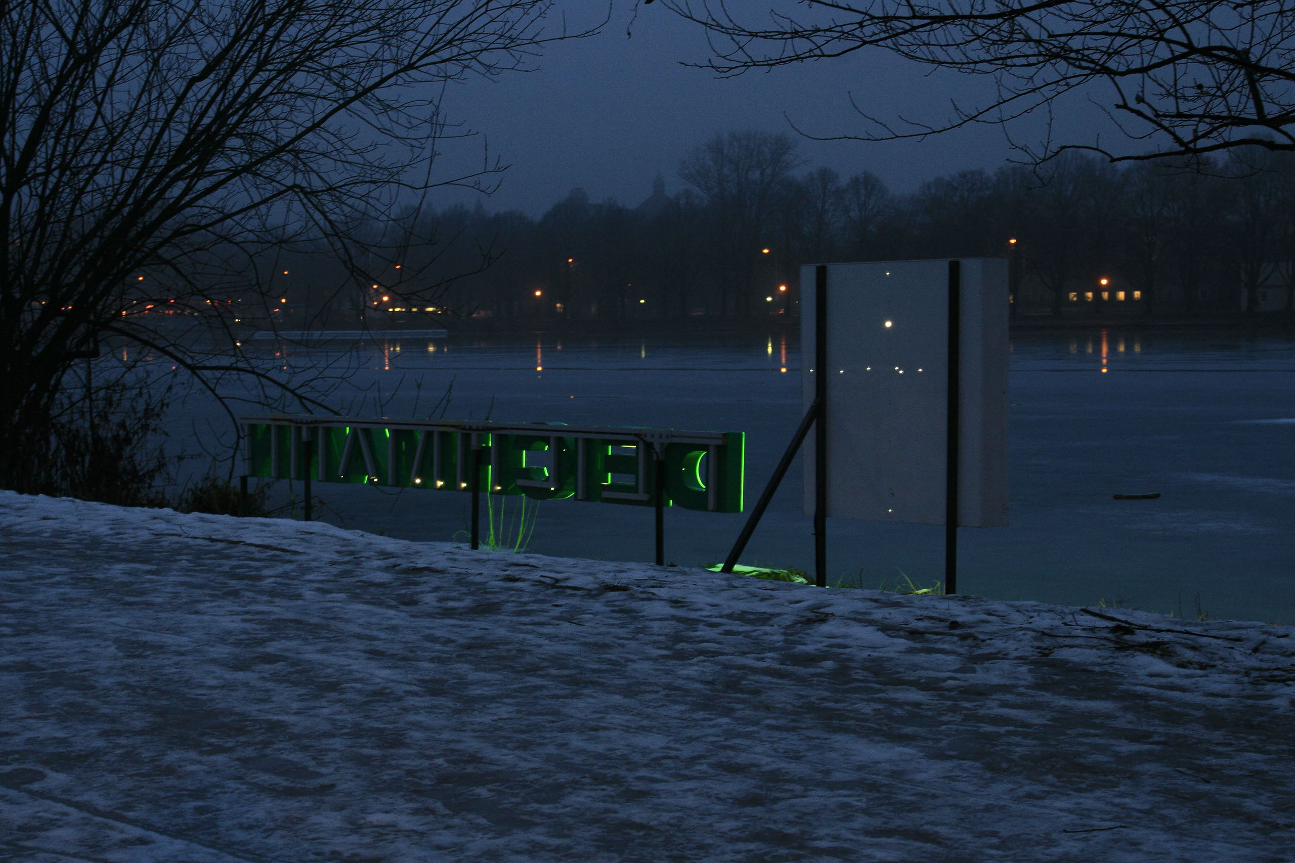 Im Rahmen eines Ausstellungsprojektes rund um den Maschsee in Hannover werden im Uferbereich Leuchtreklamen aufgestellt.