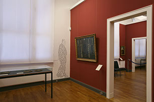Die Installation von lebensgroßen Schriftsilhouetten in den Museumsräumen macht ein Charakteristikum der Aufsicht sichtbar, die stets unscheinbar, gleichzeitig aber auch allgegenwärtig sein soll, wobei die Uniform hilft, die Person verschwinden und so zu einem Teil des Systems Museum. werden lässt.