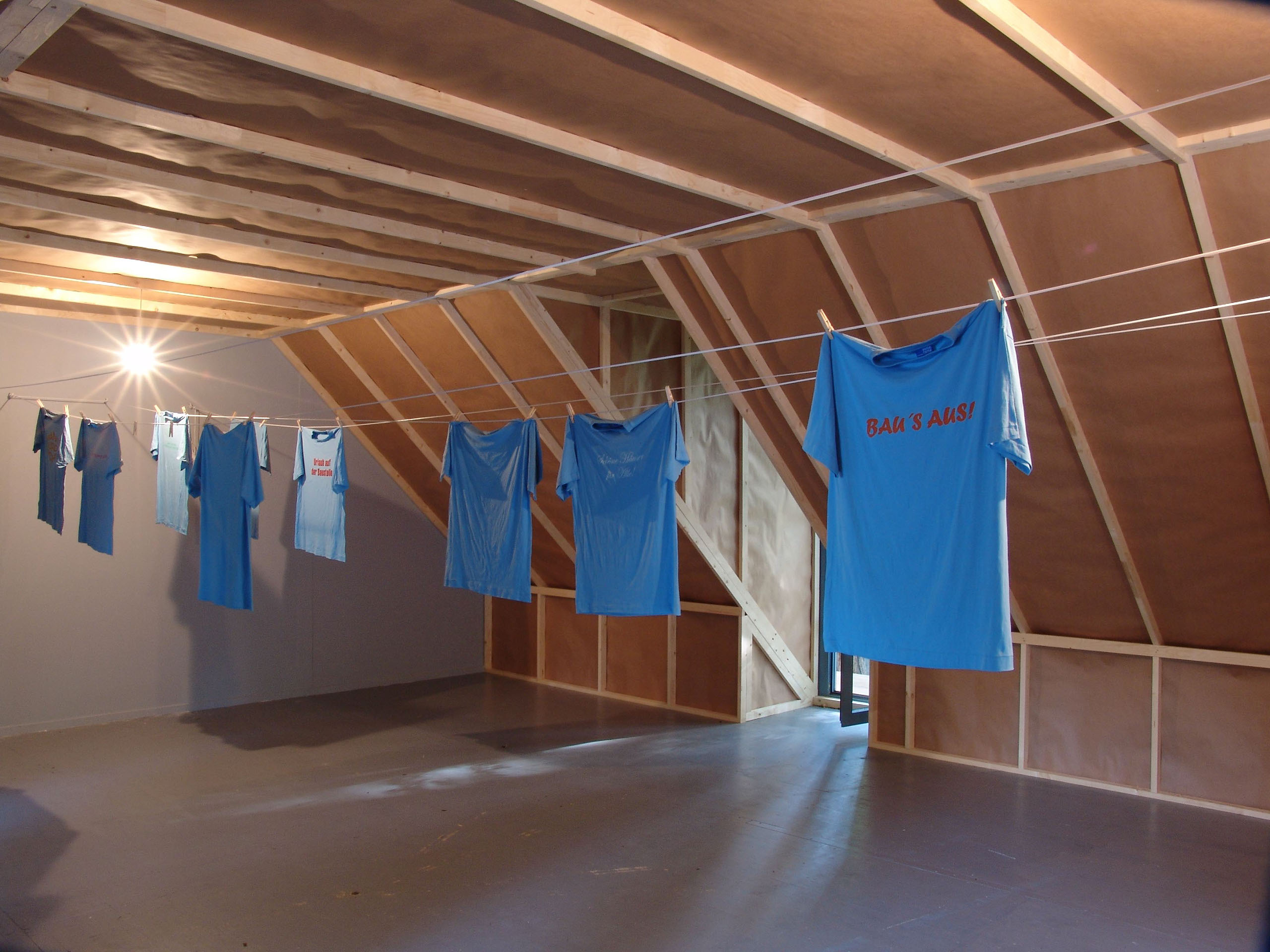 Der Besichtigungstermin fällt auf das Datum der Ausstellungseröffnung. Im Ausstellungsraumes sind T-Shirts auf einer Leine zum Trocknen augehänt, auf deren Vorderseite bekannte Slogans aus DIY- , Bauzeitschriften bzw. aus der Architekturtheorie zu lesen sind: