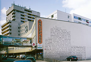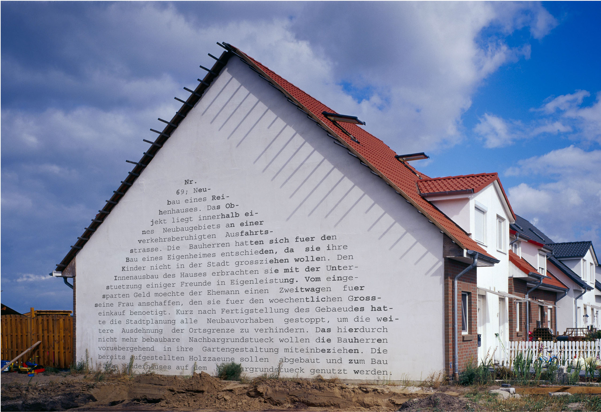 „Diese Spannung, die aus den besagten gegensätzlichen Sphären entsteht, macht sich die Arbeit Stefan Maucks zunutze. Mauck setzt dabei an einem dringenden menschlichen Bedürfnis an, der Neugier. Der Betrachter verbindet die Auskünfte, die ihm die Texte geben, mit subjektiv an oder über diesem Ort Erlebtem und Empfundenem. Es geht um den Wunsch nach erweiterter Sicht auf das Umfeld, nach tieferen Kenntnissen über es und über andere. Mauck bestätigt den Wunsch, die Dinge aus ihrer Innenschau zu kennen, intime Einsichten zu gewinnen. Jedoch befriedigt er diese Sehnsucht nur unzulänglich, erweisen sich doch die gegebenen Informationen als austauschbare Module, so austauschbar und unspezifisch – irgendwie auch monoton - wie die Architektur selber, auf denen sie angebracht sind. Insofern spiegelt die Arbeit auch etwas Erschreckendes wieder: die Austauschbarkeit von Modellen – seien es Wohnmodelle, Lebensmodelle oder Denkmodelle. I