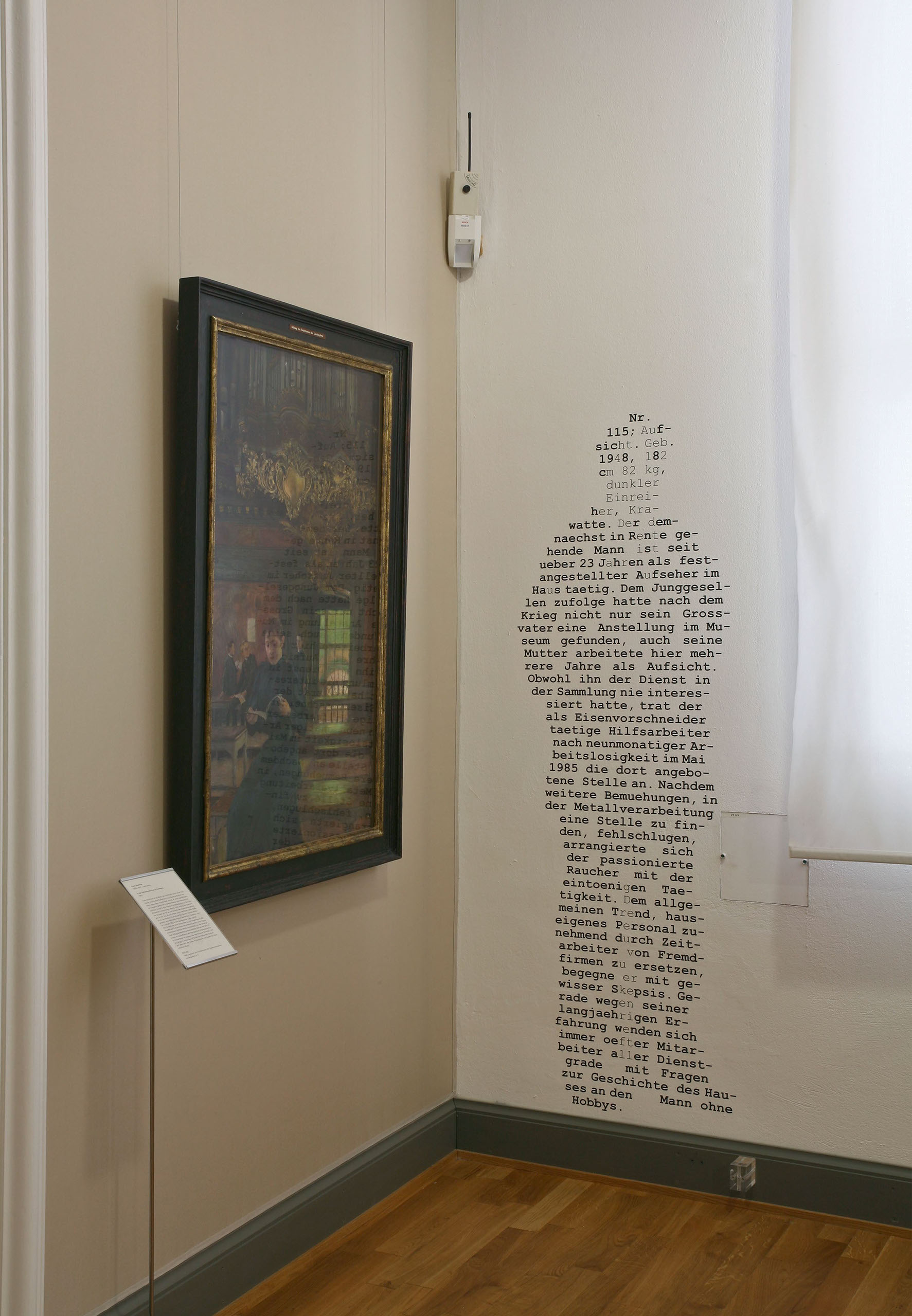 Die Installation von lebensgroßen Schriftsilhouetten in den Museumsräumen macht ein Charakteristikum der Aufsicht sichtbar, die stets unscheinbar, gleichzeitig aber auch allgegenwärtig sein soll, wobei die Uniform hilft, die Person verschwinden und so zu einem Teil des Systems Museum. werden lässt.