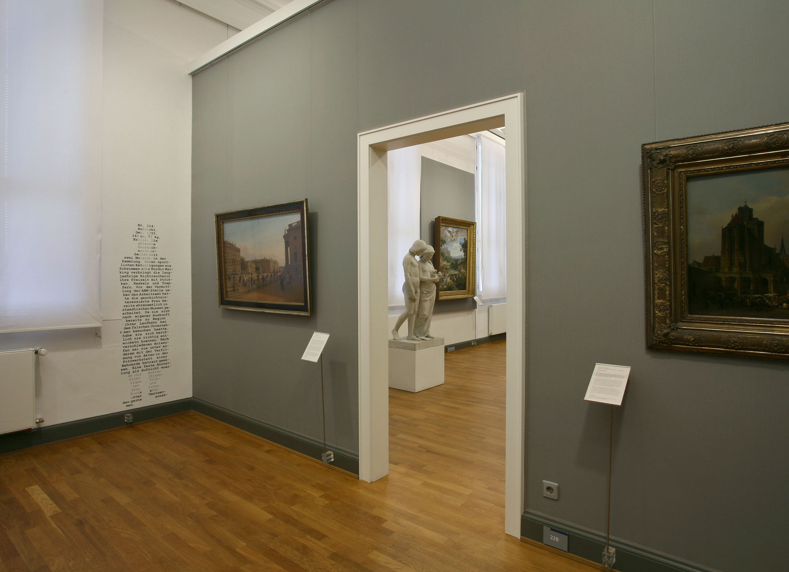 Innerhalb der Ausstellung "Wildwuchs - Interventionen aktueller Kunst" im Landesmuseum Hannover wird die Figur der Museumsaufsicht zum Gegenstand dreier Textbilder. Dabei werden anhand der Ergebnisse einer Befragung von verschiedenen als Aufsichtspersonal tätigen Museumsangestellten halbfiktive Lebensbeschreibungen erstellt.